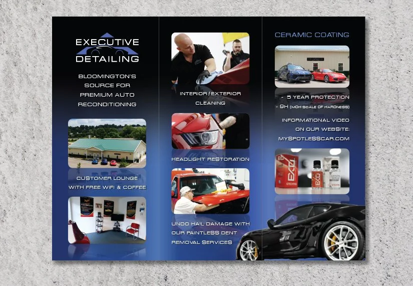 Logo and brochure design for a car detailing business. The design was inspired by organizational charts that companies often use to show departments of employees and who they report to. These are often triangular in shape with the executives at the top and the various departments branching out below.